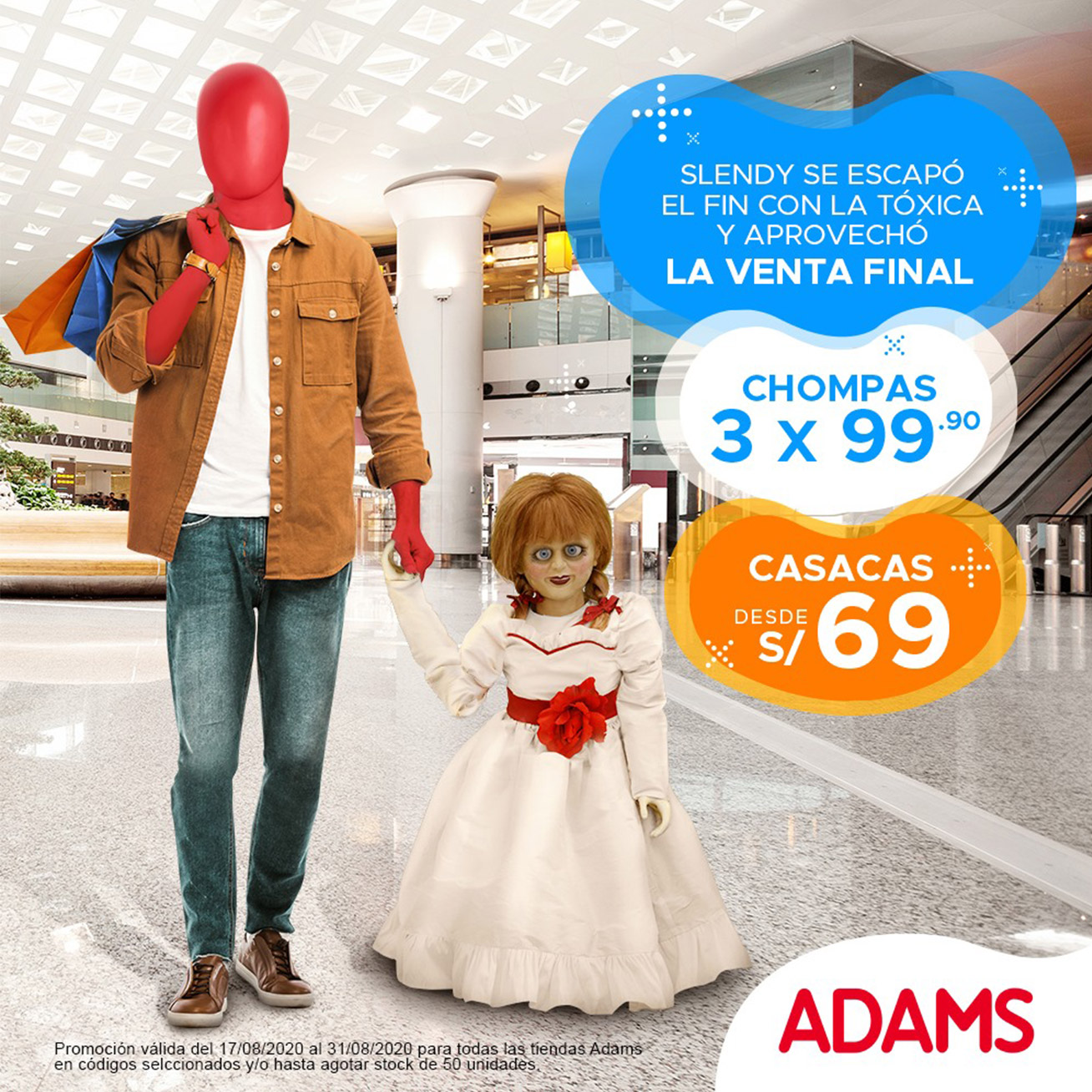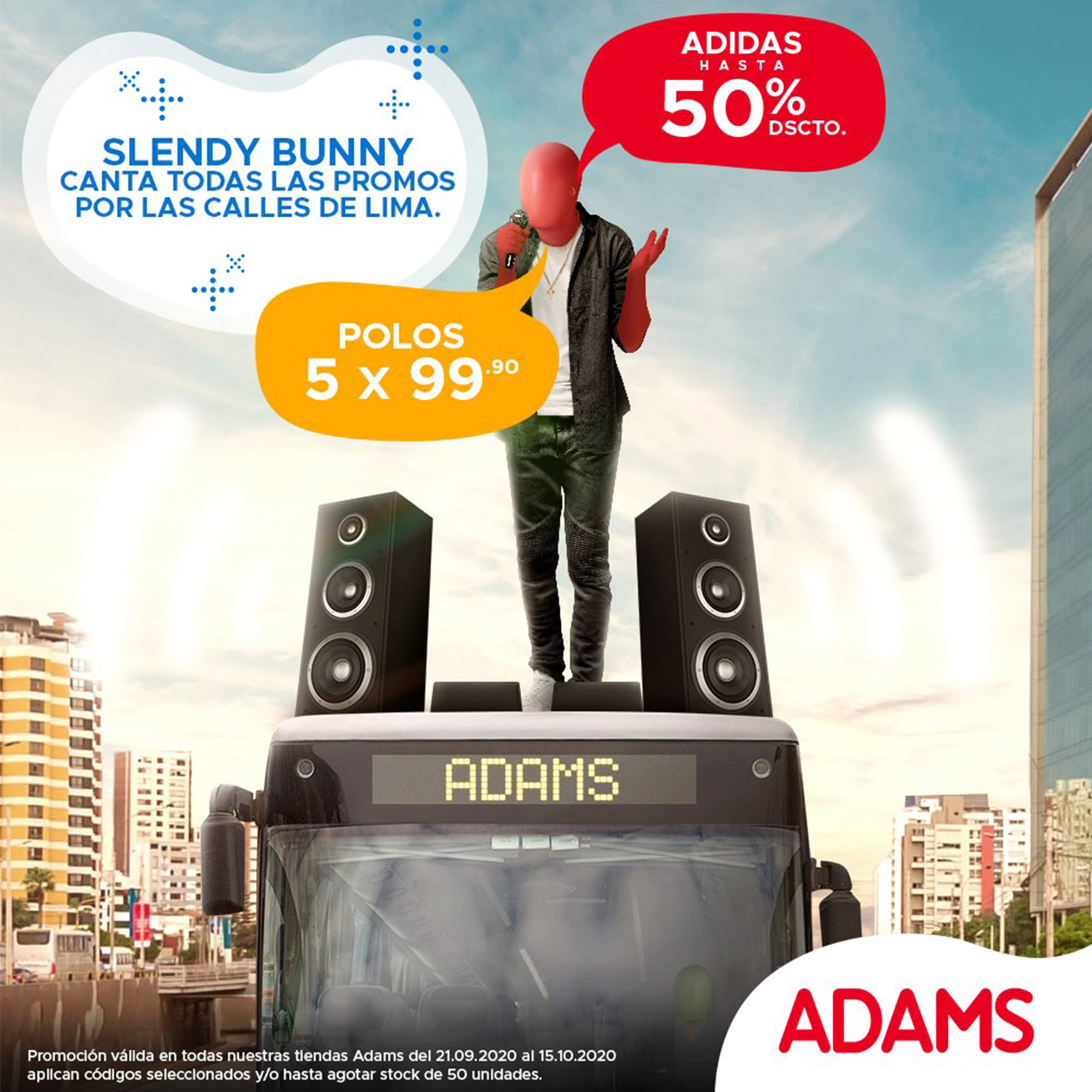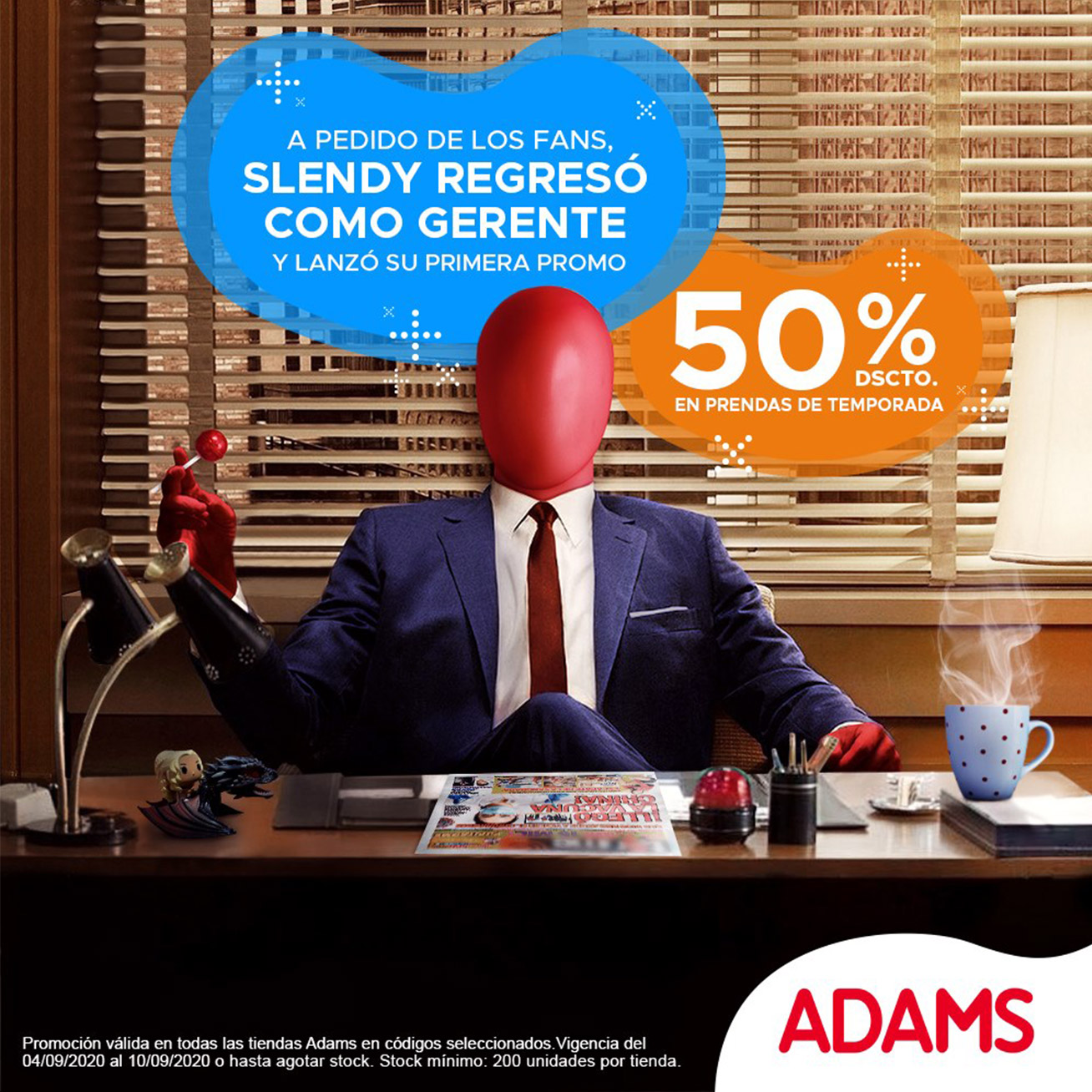 Tiendas ADAMS se caracteriza por ser una marca con actitud y estilo, es por eso que creamos a Slendy, el personaje ícono de la tienda; un maniquí rojo, divertido e irreverente que se apodera de los temas coyunturales para promocionar la marca.